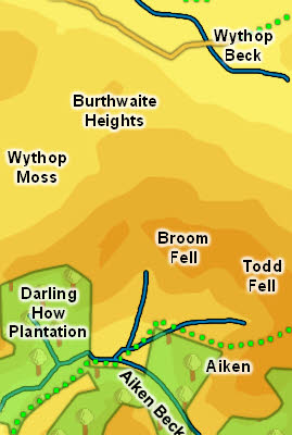 Broom Fell lacks clear boundaries. In the east the boundary with Lord's Seat falls somewhere on the Todd Fell ridge, between two nameless becks. To the south-west it had a short footing on Aiken Beck, but the western boundary is formed by another nameless beck, flowing down from Widow Hause.