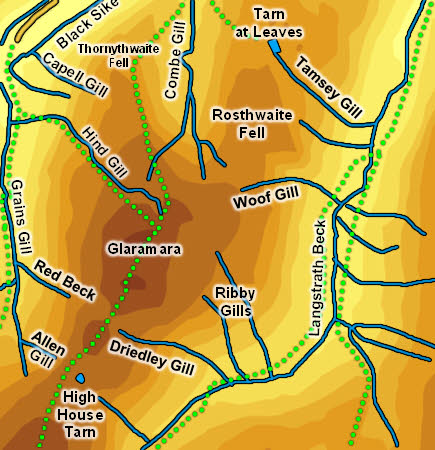 The top of Glaramara is normally reached either along the ridge from the false Esk Hause in the south via Allen Crags or up Thornthwaite Fell from Borrowdale. This northern ridge always feels longer than expected under foot, and it is just over two miles from the top to Strands Bridge. Some of this route can be rather wet. The right of way shown running alongside Hind Gill isn't obvious from the valley bottom.