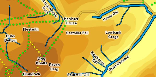 On its eastern flank Grey Knotts is bordered by Sourmilk Gill which flows out of Gillercomb then turns east to drop down into Borrowdale. This flows into the young River Derwent which forms the rest of the eastern boundary. A number of becks flow into the river from this flank, including Newhouse Gill.