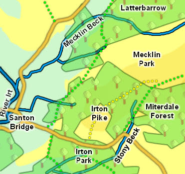 To the north a nameless beck rises beween Irton Pike and Mecklin Wood, and flows west to merge with Mecklin Beck. The combined fells then run west into the Irt just upstream of Santon Bridge.