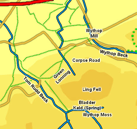 Ling Fell is access land, but rather lacks rights of way. Only two cross the full - one that runs across the western flank, but stops at the south-western corner of the fell and Green Lonning, which cuts across the north-western corner of the fell. There is also the remnants of a Corpse Road cutting across the northern slopes, but this comes to sudden end near the fence. Another track runs around the eastern flank of the fell, branching off the Corpse Road near its eastern end. None of the slopes are really too steep to climb, so the walker can reach the summit from just about any direction (just be aware of that pesky fence).