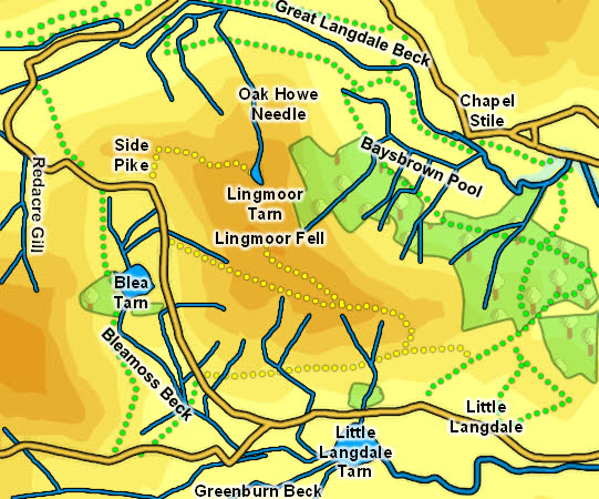 The northern boundary is formed by Great Langdale Beck, which flows past the fell and into Elterwater. Lingmore Fell can thus claim a short footing on that lake.