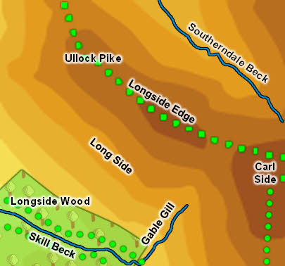 As part of a ridge Long Side is bordered by two streams - Southerndale Beck in the north and Skill Beck in the south. The only beck that actually runs down the ridge itself is Gable Gill, which runs south between Longside and Carl Side.