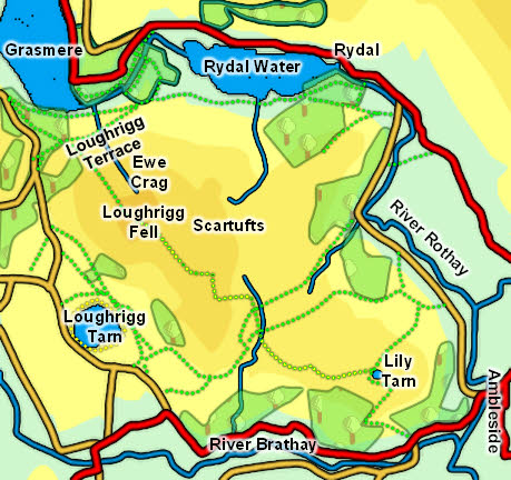 Loughrigg Fell is mainly bordered by rivers - in the north and east the Rothay and in the south the Brathay. The western boundary is formed by nameless becks the longer of the two flowing south into Elter Water.