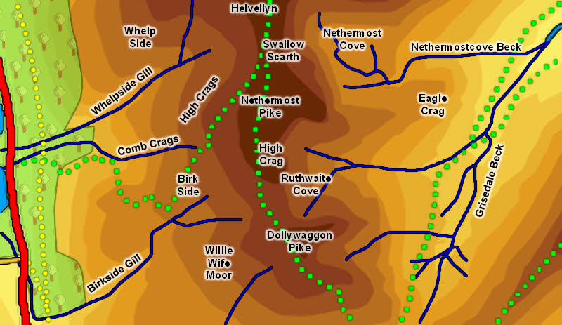 The western boundary with Helvellyn is formed by Whelpside Gill, which runs west/ south-west to the lake.