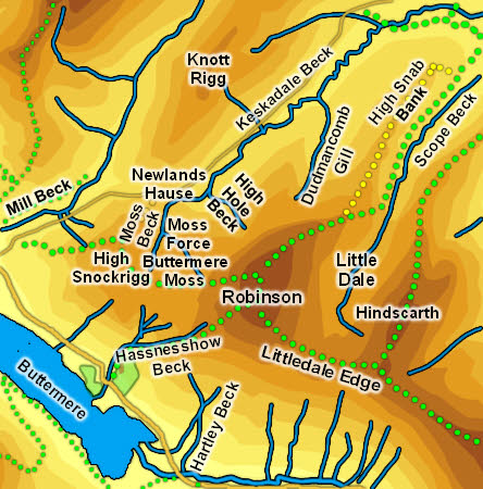 A sizable number of becks rise on Robinson, but all are short and very few have names. The named tarns start with Moss Beck, which drops off the northern edge of Buttermere Moss, forming Moss Force. To the east of this is High High Beck, which rises below Robinson Crags and soon joins Keskadale Beck. Next along is Dudmancomb Gill, which rises behind Robinson Crags and runs north into Keskadale Beck.