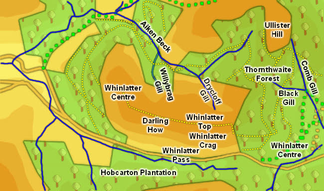 Whinlatter fell is part of the system of fells centred around Lord's Seat. Four ridges run away from this fell. The south-eastern ridge runs to Ullister Hill, then curves around to the south-west, dipping as it crosses Tarbarrel Moss before turning west and climbing to form Whinlatter. This fell runs west along the top of the pass and then curves north-west, so the overall ridge forms a semi-circle enclosing the valley of Aiken Beck. None of this is seen from the road, where the fell is seen as a single uninterrupted steep slope, bare of trees, looming over the pass.