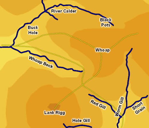 Whoap Beck rises under the south-west slopes of the fell and flows west to join the Calder just below Buck Hole. The combined waters then flow west for just under a mile before turning south to begin the Calder's run to the sea.