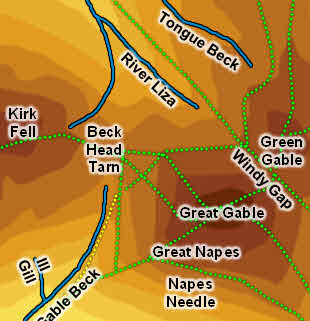 Our ascent of Kirk Fell passes the tarn, and our ascent of Great Gable via the north-west ridge comes very close.