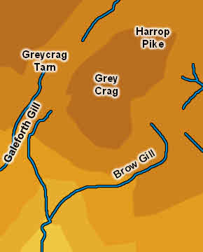 The terrain to the north and east of the tarn is generally easy, although lacking paths and with long approach walk requires. The easiest route comes from Sadgill in Longsleddale, where there is a small amount of parking. Climb up the field east of the road, heading for a stile visible in the upper wall. A clear path leads up to a very easy gully, and beyond it another wall. The path runs right along this wall for a short distance then crosses over and heads up Great Howe. A clear path heads along Great Howe towards Tarn Crag and Sleddale Fell. This crosses a fence and then curves away for Sleddale Fell. To reach the tarn leave this path before it begins to curve away to the right and head up a dry gully towards the skyline. This brings us to the eastern edge of Greycrag Tarn's bog.