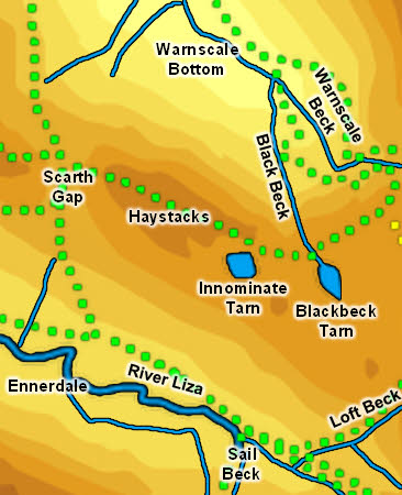 Innominate Tarn is best reached along the summit path on Haystacks. This can be reached by following the old tramway from Honister Pass. From Buttermere you can reach it either via Scarth Gap or up the path up Warnscale Bottom from Gatesgarth. From Ennerdale the best route is up to Scarth Gap from Black Sail YHA.
