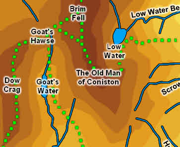 Three unnamed becks flow into Low Water, one from below the summit of the Old Man of Coniston, one rising below the summit of Brim Fell and one from the ridge that runs east towards Raven Tor.