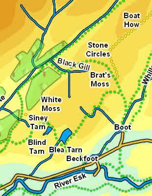 The tarn can also be reached from Miterdale. Cross the Mite at Low Place and follow the path that runs up the valley. After a short distance turn right onto a path that climbs up the hillside in a gap between former plantations. At the top of the climb take a path that branches off to the left heading across the flatter fell top towards Siney Tarn and Blind Tarn.