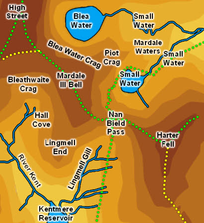 Small Water can be reached along the footpath that leads from Mardale Head into the Kentmere Valley, heading over Nan Bield Pass. This used to be a busier route when Mardale had a thriving village, but is still a good walkers route.