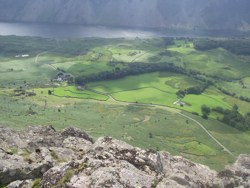 The area below Buckbarrow seen from the top of the crags. The familiar road into Wasdale cuts across the picture, while Wast Water and the screes form the top of the picture.