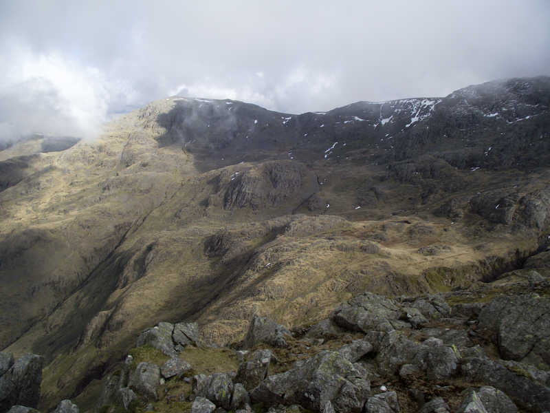 A view of the corridor route from Lingmell. The path is rarely visible, but this does show the area that it crosses rather well.
