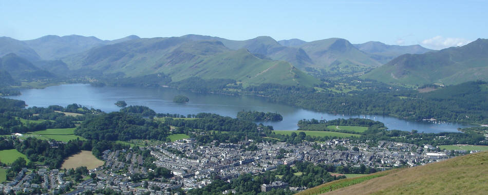 A full length view of Derwent Water with Keswick in the foreground, taken from the summit of Latrigg.