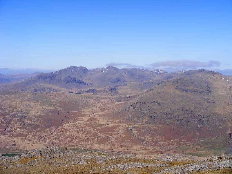 This is the view of the Scafell range from the top of Grey Friar, with the valley of Moasdale in the foreground. Scafell Pike is in the centre of the picture, with Scafell to the left and the ridge up to Great end to the right. On the right of the picture we look along Crinkle Crags towards Bow Fell, with the summit seen as a small rise.