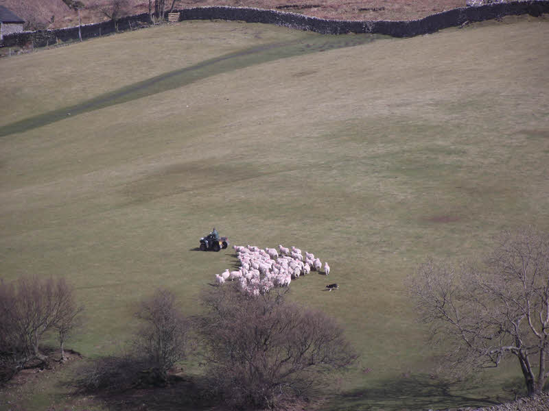 Sheep being herded by a combination of a farmer on quad bike and a single sheep dog near the northern end of Boredale.