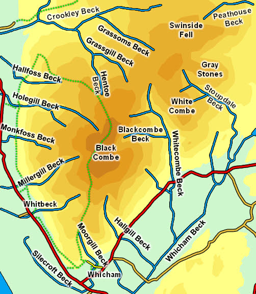 In the north-east Peathouse Beck flows out of Black Combe. The boundary is then formed by Whicham Beck, which rises between Whitecombe Head and Swinside Fell then turns south and runs down the Whicham valley, eventually reaching the sea in rather confused flat ground between Silecroft and Kirksanton.