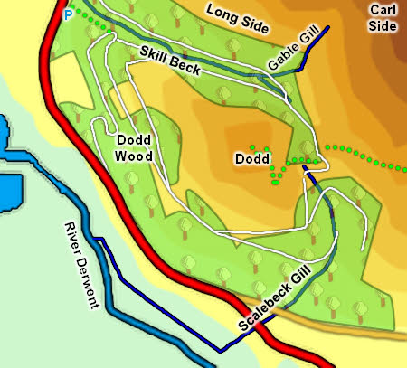 Dodd is surrounded by a network of forestry tracks. The easiest way to the top is to follow either of the tracks that run alongside Skill Beck. These reach Long Doors, the pass between Dodd and Carl Side. Just before the top of the pass a path branches off to the right, then curves around the southern side of the fell before eventually turning into a footpath that climbs up the open fellside to the summit.