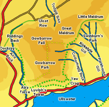 Gowbarrow Fell is only connected to other high ground at its north-eastern corner, where a ridge leads over Great Meldrum and Little Meldrum before ending with the grassy lump of Little Mell Fell.