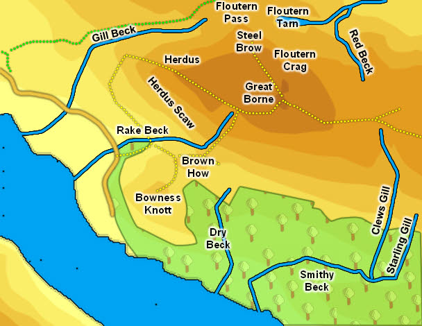 A more obscure and difficult route follows the path up to the col between Brown How and Great Borne, then climbs up alongside Brown How. This involves some scrambling on rock, and a good head for heights (I've talked to people who use this route). It is also possible to climb up the rock field to the east of crags by the beck - I've used this route, which is acceptable if a bit steep towards the top. To avoid the most difficult climb continue east above the tree line towards Clews Gill, and ascend the easier slopes or follow the line of the gill, then turn left to reach the summit.