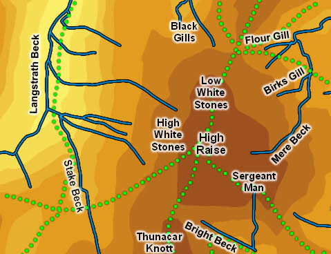 In the north Greenup Gull rises close to Greenup Edge and flows north-west into Langstrath Beck. Nameless becks form general boundaries between the bulk of High Raise and Sergeant's Crag.