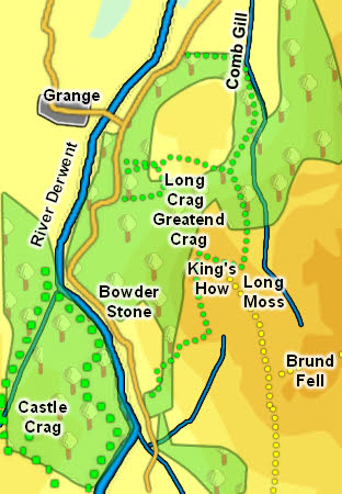 The north, west and south faces of King's How are all very steep and craggy, although many of the crags are hidden by the blanket of trees that cover most of tech slopes. Even to the east the summit is protected by a line of crags, although there is only a 200ft drop from the summit to Long Moss in the valley below. The fell is the western edge of Grange Fell, a large upland area that also included Brund Fell, and forms part of the barrier between Borrowdale and the side valley of Watendlath.