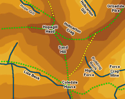 To the north Hobcarton Crag really marks the edge of Sand Hill rather than any becks in the valleys below. To the south-east Pudding Beck forms the boundary with Grisedale Pike, running amongst the upper, and far less well known, part of Force Crag Mine. There is no beck in the top of the valley that runs east from Coledale Hause and forms the boundary with Crag Hill.