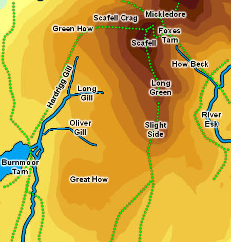 Quagrigg Moss is the south-western boundary, dividing Scafell from Great How. Oliver Gill, which runs out of the Moss, runs into Hardrigg Gill, which is born on the western slopes of Scafell (as does Long Gill, which joins Hardrigg Gill further up). The combined streams join Whilllan Beck just downstream of Burnmoor Tarn.