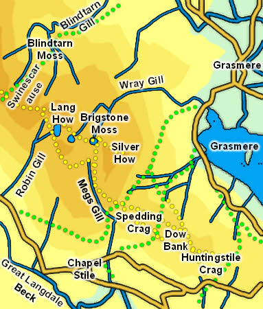 Like most of the intermediate summits on this ridge the exact boundaries of Silver How are up for debate. To the west the boundary is clear - Wray Gill runs north from Brigstone Moss then east into Grasmere, and is matched by Megs Gill, which runs south into Great Langdale Beck. These becks form the western edge of a triangular plateau, with the summit at the eastern corner overlooking Grasmere.