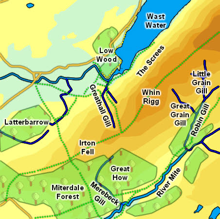 Greathall Gill flows into the River Irt just below Wast Water. The lake forms the northern boundary of the fell.