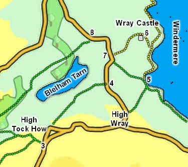 Blelham Tarn sits between two paths, neither of which quite reaches the tarn. To the north is a track that run from Outgate to the road north of Wray Castle. To the south is a path that runs from Hole House on the road west of High Wray across to the road south of Wray Castle. Both paths offer good views across the tarn. A permissive path runs past the western edge of the tarn.