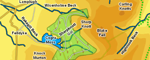 Three becks flow into Cogra Moss. A short nameless beck rises between High Hows and Sharp Knott and flows into the northern side of the tarn.