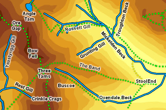 Busco Sike flows out of the Three Tarns area, and runs alongside the Band before merging with a number of other streams to form Oxendale Beck, which itself flows into Great Langdale Beck then joins the River Brathay.